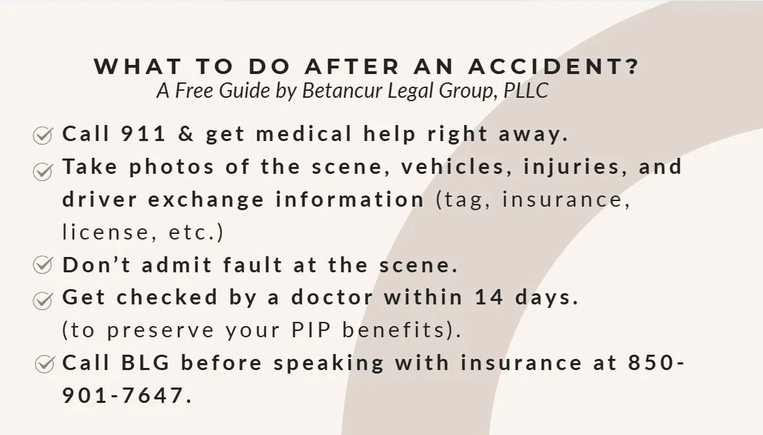 At Betancur Legal Group, our legal team helps accident victims across Tallahassee and Leon County navigate the process from start to finish. We’ll protect your rights, handle the paperwork, and fight for the maximum compensation you deserve—so you can focus on recovery.
